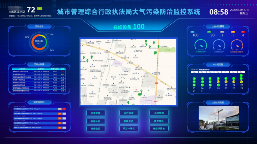 可通過大屏展示整體信息的概述頁面,以圖表形式直觀展示污染排放情況,包括實時地圖、設備類別、污染排名、污染月歷圖、污染占比、設備管理情況等模塊,可根據具體操作需求定制。
